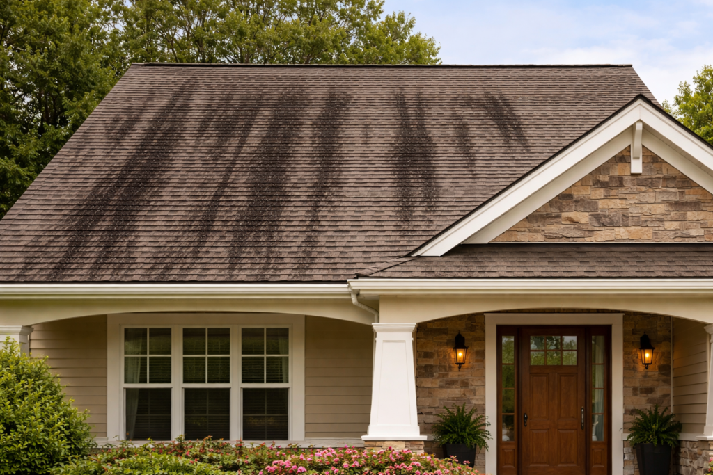 Algae appears as flat, dark streaks or stains that run down your roof. It discolors the shingles but has no real texture.